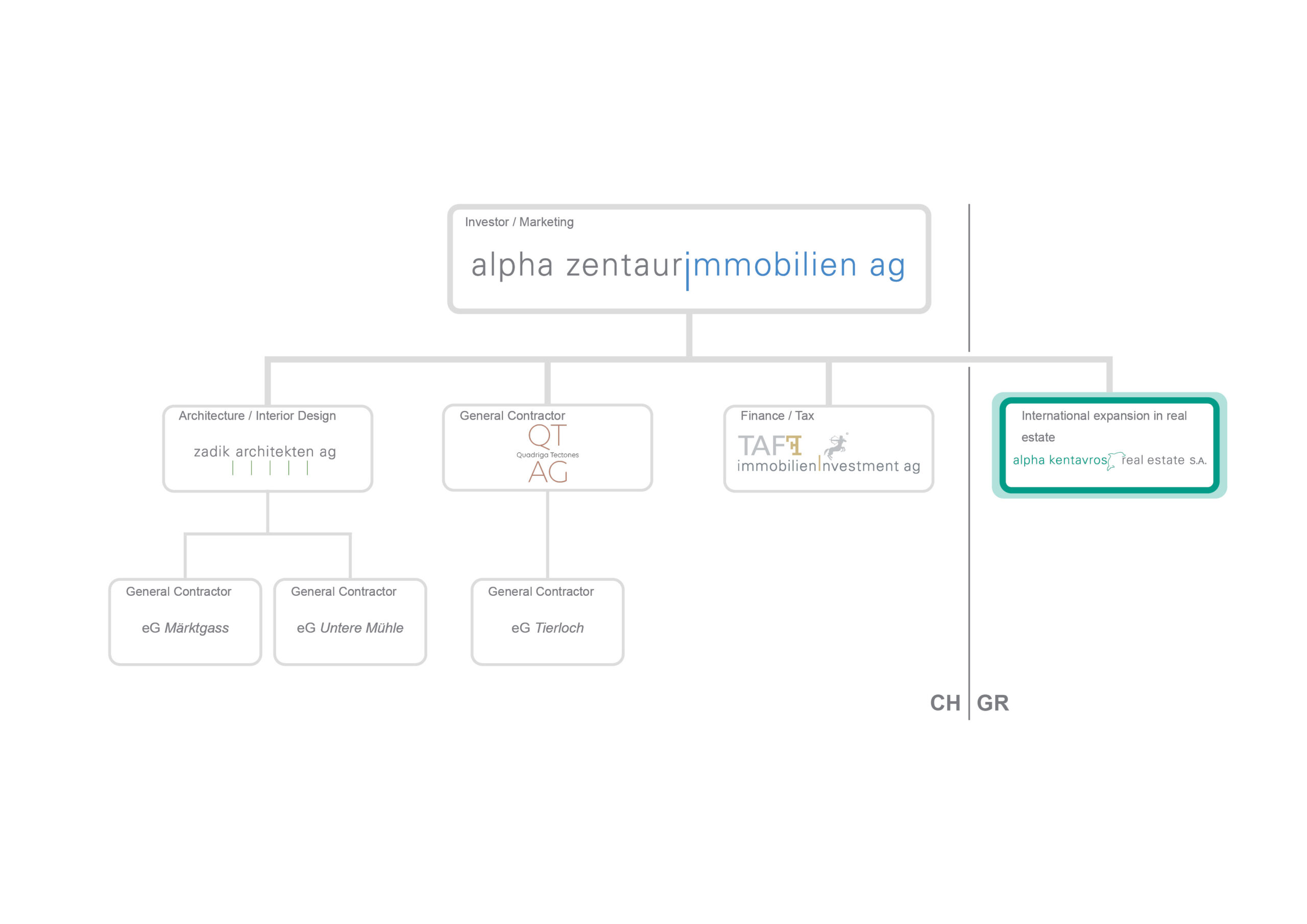 alpha zentaur group refers to the corporate structure comprising alpha zentaur immobilien ag and its four subsidiaries. Named subsidiaries are: zadik architekten ag, TAFF Immobilien Investment AG, Quadriga Tectones AG (QTAG for short) and Alpha Kentavros Real Estate S.A. The alpha zentaur group assumes several tasks in the field of real estate. Its competencies include project development, real estate trading, brokerage, (interior) architecture, design, general contracting and real estate investment as well as financing.